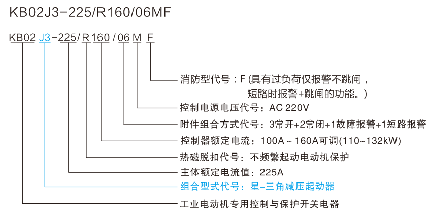 適用于電動機星-三角減壓起動的控制與保護,以KB02產(chǎn)品作為主開關,與塑殼斷路器、可逆接觸器、時間繼電器、電氣聯(lián)鎖及控制回路組合構成星-三角減壓起動的控制與保護裝置。